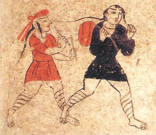 除此之外,河西彩繪壁畫磚圖像中,還有一些反映娛樂的圖像,主要有樂舞圖和六博圖。高臺地埂坡壁畫中的“角抵百戲”中,一著辮者在作表演,他小腿部網(wǎng)狀綁腿,蹲踞,雙手?jǐn)傞_,似乎是在表演魔術(shù),又似乎是在歡迎到場的人們。“擊鼓”中,兩人網(wǎng)狀繃腿,髡發(fā)梳辮,著黑裝者背鼓,著紅裝者持雙鼓槌準(zhǔn)備擊鼓。孫機(jī)先生謂,戰(zhàn)國迄漢盛行六博,博具和博戲的圖像在考古資料中不乏其例。甘肅以武威磨嘴子漢墓出土木六博俑為例。六博俑以簡單明確的藝術(shù)造型,刻畫了兩個老者全神貫注博弈的場面,惟妙惟肖地表現(xiàn)出對弈時蓄勢待發(fā)的場面。在高臺壁畫墓中的博戲場面略有不同,二博者戴船形帽,打手勢。從相貌看,很可能是少數(shù)民族。高臺出土彩繪壁畫磚上,兩人動作幅度更大,左邊一人的黃紅色著裝和博具上的零散物品,顯得場面更為熱烈激情。