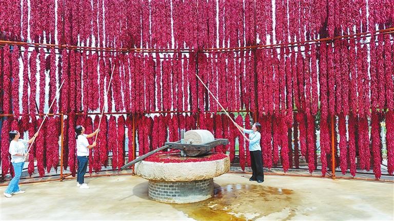位于甘谷縣安遠(yuǎn)鎮(zhèn)上河灣村的甘肅隴上椒農(nóng)業(yè)科技(集團(tuán))有限公司,工作人員正在晾曬辣椒。新甘肅·甘肅日報(bào)通訊員 王啟寧