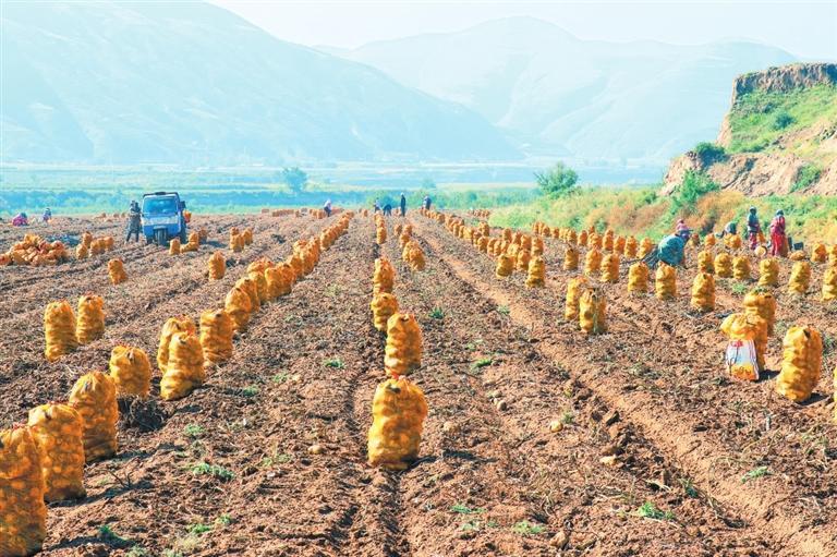 定西市安定區(qū)魯家溝鎮(zhèn)村民在分揀、裝運(yùn)收獲的馬鈴薯。新甘肅·甘肅日報(bào)通訊員 胡耀偉