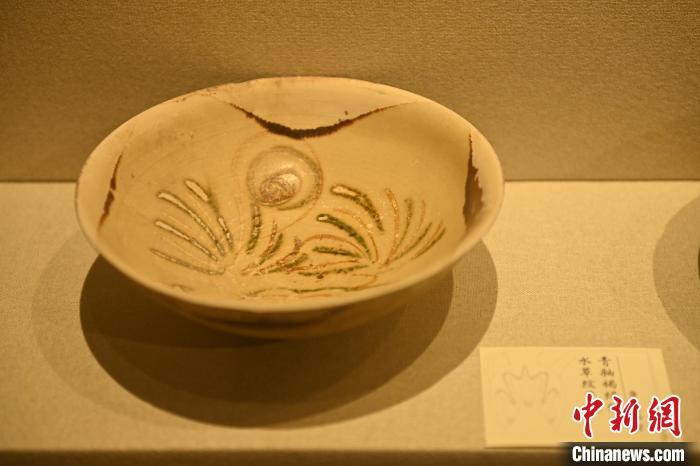 10月27日,在甘肅省博物館內(nèi)展陳的青釉褐綠彩水草紋瓷碗。中新社記者 李亞龍 攝
