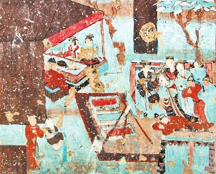 古人會在一年的歲末舉行一次集體聚會,稱作“建福”。在敦煌文獻《社司轉(zhuǎn)帖》中寫道:“右緣常年建福一日,人各爐餅壹雙,凈粟壹斗。幸請諸公等,帖至限今月廿二日卯時于安家酒店取齊。”意思是說,只要有可能,每年到了年末大家都要選擇一日來進行建福。每家每戶需要按時把準備建福的物資送過來。唐朝詩人李白在《客中行》一詩中寫道:“蘭陵美酒郁金香,玉碗盛來琥珀光。但使主人能醉客,不知何處是他鄉(xiāng)。”意思是說蘭陵美酒甘醇甜美,就像郁金香一樣芬芳四溢。興來盛滿玉碗,泛出琥珀光晶瑩迷人。主人端出如此好酒,定能醉倒他鄉(xiāng)之客。飲酒之后哪能分清故鄉(xiāng)與他鄉(xiāng)呢?歲暮聚飲蘊含有辭舊迎新、攘兇納吉的美好愿望。在莫高窟第12窟壁畫中有一幅“帳篷酒肆圖”:畫面中圍坐在條形長桌兩邊正盡興暢飲的客人為七人,還有兩個熱情忙碌的服務(wù)人員。整個畫面是一幅酒酣耳熱、興致高昂的歡飲圖。更為氣勢恢宏、熱鬧非凡的是莫高窟第23窟壁畫中一幅“院落圖”:畫面中分院落之內(nèi)與院落之外兩個部分,院落之內(nèi)是世俗的世界,畫面上布局著鱗次櫛比的廳堂房屋,有人正在庖廚、有人正在對弈、有人正在暢聊、有人正在團聚,也有人正在說教,總之表現(xiàn)的是我們?nèi)粘I畹陌賾B(tài)。院落之外是佛國世界,整體呈現(xiàn)出肅穆莊嚴之感。有趣的是在佛國與世俗世界中間,畫的是服飾艷麗,騎馬遠行的人們。