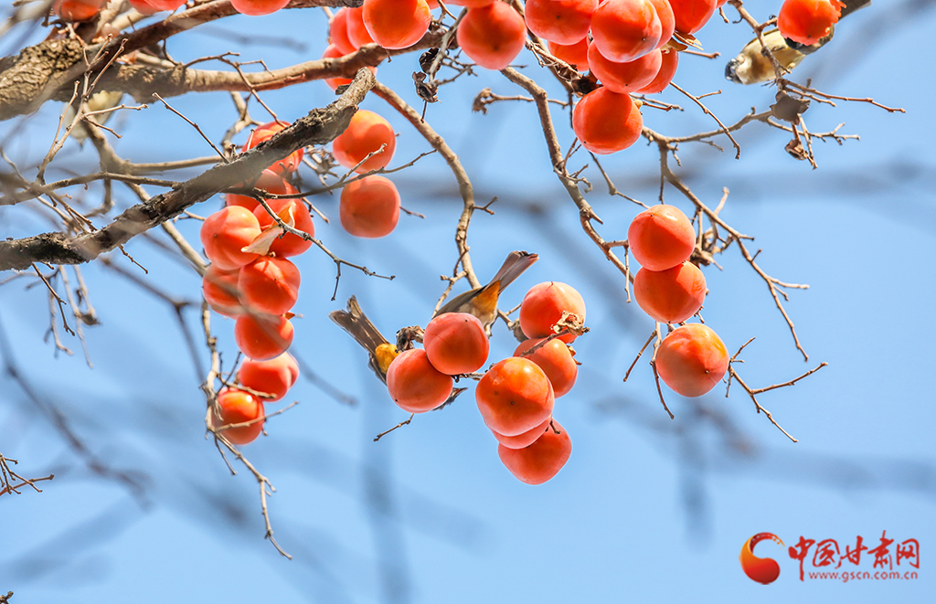 繁華落盡,枝條上一簇簇、一叢叢火紅的柿子在微風中搖曳,吸引麻雀前來“聚餐”。麻雀們時而啁啾歡唱,時而蹦跳覓食,小巧的身影與柿子交織在一起,勾勒出一幅生動的冬日畫卷。