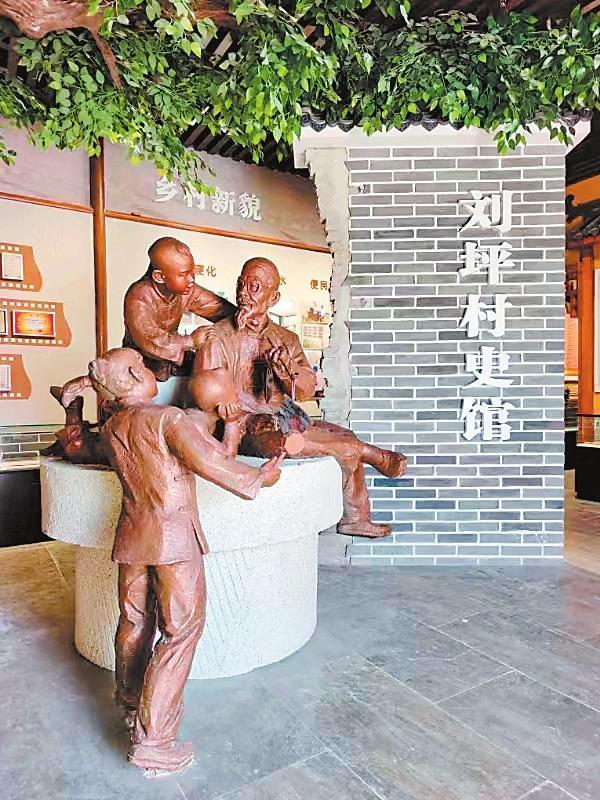 年復(fù)一年的寒來暑往中,大榆樹,也就成了劉坪村的望鄉(xiāng)臺。每個村莊,都有它的望鄉(xiāng)臺,它承載著人們共同的記憶,是人們重溫鄉(xiāng)愁的地標(biāo),永遠(yuǎn)鐫刻在人們的心底。2000年,電視劇《黃沙下面是沃土》的劇組來到劉坪村拍攝取景,村里的望鄉(xiāng)臺大榆樹被拍進(jìn)電視劇畫面。在劉坪村村史館布設(shè)中,專家和學(xué)者數(shù)易村史館方案,最終確定在村史館正門之內(nèi)塑造一組雕塑,意思是由一位老人講述劉坪村的村史,作為村史館的題眼,村史館內(nèi)還陳列了《劉坪村志》,分為建置、地理、村落文化、風(fēng)土人情等14卷,共40萬字。館內(nèi)能播放劉坪村村史專題片《耕讀傳家》。