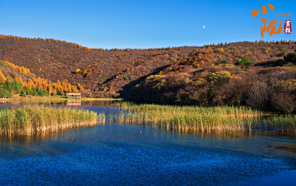 群山環(huán)抱里的朝那湫,水面開闊,清澈透明,周圍層林盡染,藍(lán)天、蘆葦?shù)褂霸诿鲀舻乃嫔希∷埔环^妙的山水風(fēng)景圖。