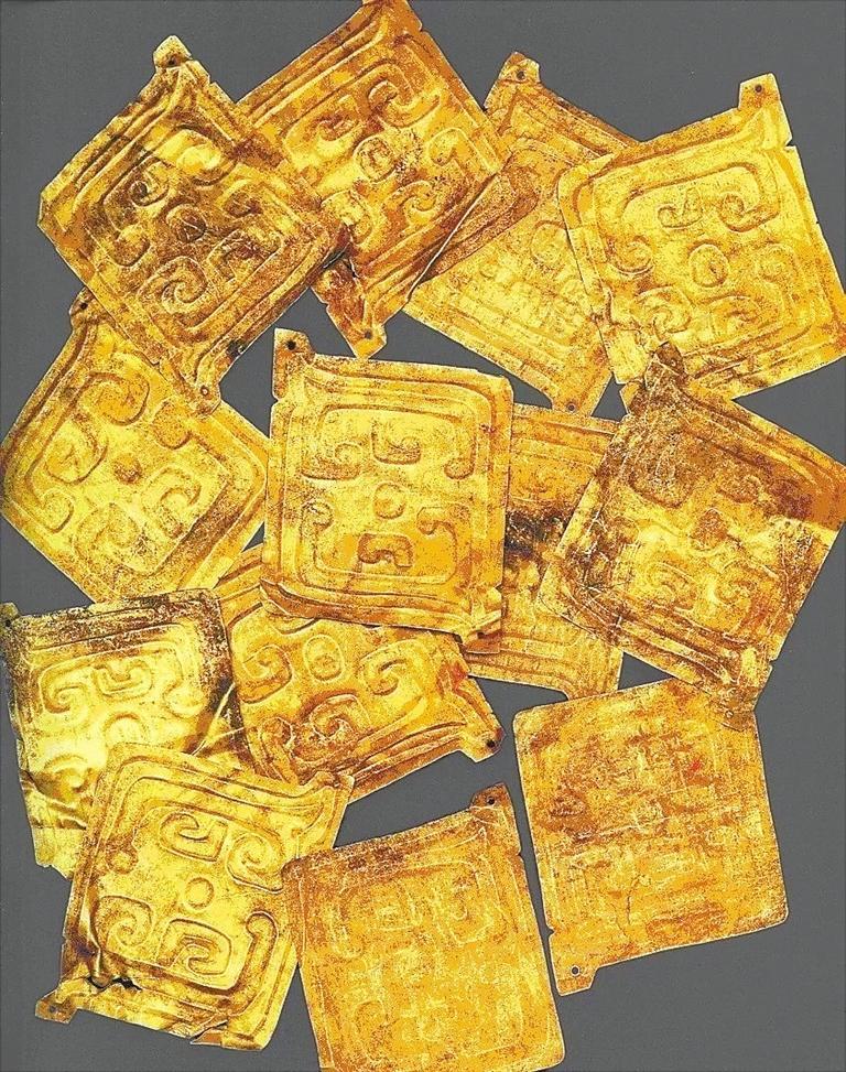 1994年春,陜西省考古研究所所長韓偉在法國、比利時訪問期間,見到了一批從香港過來的金飾片和一對金虎。韓偉先生對這組金飾片從器形、紋飾進行了分析,并參考蘇黎世研究員莫爾夫人從金虎內提取的木制標本碳-14檢測結果,認為這批金飾片為西周晚期秦人首領秦仲或秦莊公墓棺上的裝飾物。