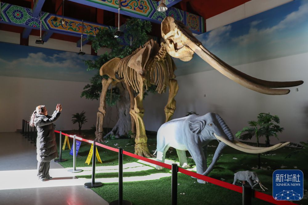 1月5日,在慶陽市合水縣隴東石刻藝術博物館黃河古象展廳,張雪峰拍攝黃河象化石(復制品)。