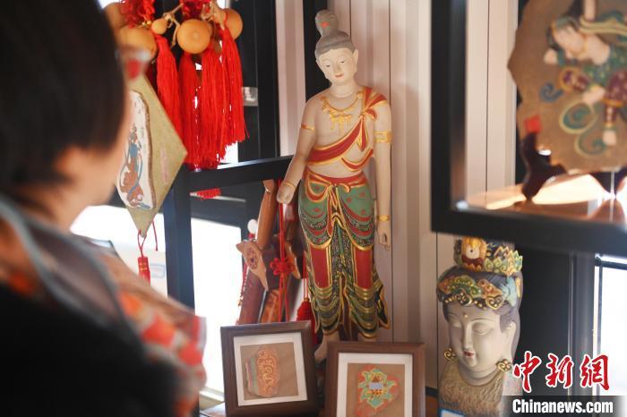 2月8日,甘肅省蘭州市城關(guān)區(qū)“非遺年貨購物月”活動現(xiàn)場,游人挑選敦煌系列文創(chuàng)產(chǎn)品。中新社記者 李亞龍 攝