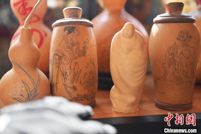 2月8日,甘肅省蘭州市城關(guān)區(qū)“非遺年貨購物月”活動現(xiàn)場展出的刻葫蘆文創(chuàng)產(chǎn)品。 中新社記者 李亞龍 攝