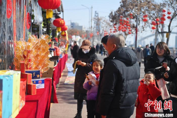 2月8日,甘肅省蘭州市城關(guān)區(qū)“非遺年貨購物月”活動現(xiàn)場,游人購買蘭州三炮臺、糖畫等傳統(tǒng)美食。 中新社記者 李亞龍 攝