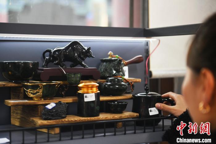 2月8日,甘肅省蘭州市城關(guān)區(qū)“非遺年貨購物月”活動現(xiàn)場,游人挑選武山鴛鴦玉夜光杯茶具。中新社記者 李亞龍 攝