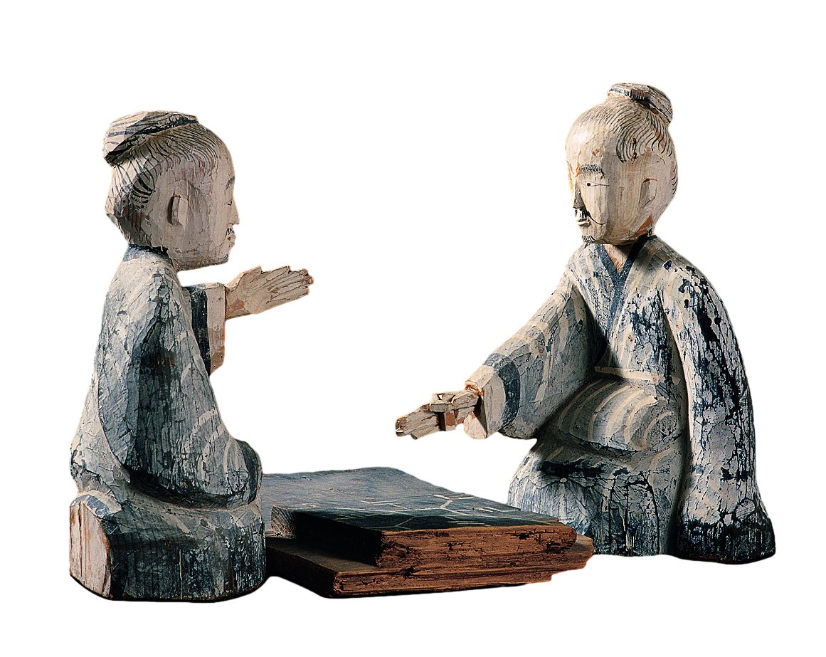 漢代 武威市磨嘴子漢墓出土 人高29厘米。 兩位老者在玩博戲,這是戰(zhàn)國(guó)到漢代非常盛行的一種娛樂(lè)形式。匠師以簡(jiǎn)單明快的藝術(shù)造型,刻畫(huà)了兩位老者全神貫注的博弈,惟妙惟肖地表現(xiàn)出對(duì)弈時(shí)蓄勢(shì)待發(fā)的場(chǎng)面。
