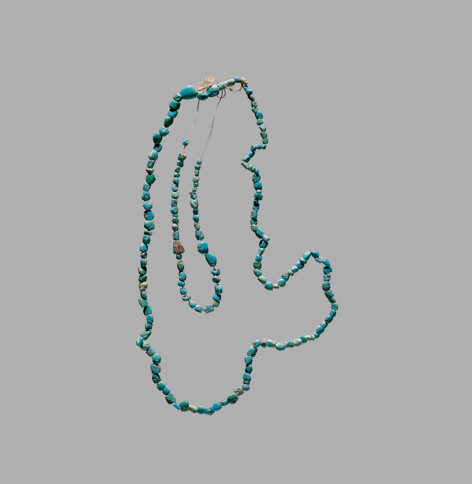 齊家文化(距今4100—3700年前)積石山縣新莊坪出土綠松石琢成不規(guī)則小珠,共有171粒,中穿孔,串穿制成。原穿連方式不明。