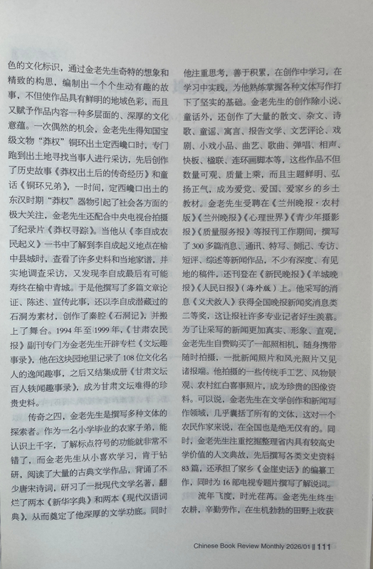 傳奇之四,金老先生是撰寫多種文體的探索者。作為一名小學(xué)畢業(yè)的農(nóng)家子弟,能認(rèn)識(shí)上千字,了解標(biāo)點(diǎn)符號(hào)的功能就非常不錯(cuò)了,而金老先生從小喜歡學(xué)習(xí),肯于鉆研,閱讀了大量的古典文學(xué)作品,背誦了不少唐宋詩詞,研習(xí)了一批現(xiàn)代文學(xué)名著,翻爛了兩本《新華字典》和兩本《現(xiàn)代漢語詞典》,從而奠定了他深厚的文學(xué)功底。同時(shí)他注重思考,善于積累,在創(chuàng)作中學(xué)習(xí),在學(xué)習(xí)中實(shí)踐,為他熟練掌握各種文體寫作打下了堅(jiān)實(shí)的基礎(chǔ)。金老先生的創(chuàng)作除小說、童話外,還創(chuàng)作了大量的散文、雜文、詩歌、童謠、寓言、報(bào)告文學(xué)、文藝評(píng)論、戲劇、小戲小品、曲藝、歌曲、彈唱、相聲、快板、楹聯(lián)、連環(huán)畫腳本等,這些作品不但數(shù)量可觀、質(zhì)量上乘,而且主題鮮明、弘揚(yáng)正氣,成為愛黨、愛國(guó)、愛家鄉(xiāng)的鄉(xiāng)土教材。金老先生受聘在《蘭州晚報(bào)·農(nóng)村版》《蘭州晚報(bào)》《心理世界》《青少年攝影報(bào)》《質(zhì)量服務(wù)報(bào)》等報(bào)刊工作期間,撰寫了300多篇消息、通訊、特寫、側(cè)記、專訪、短評(píng)、綜述等新聞作品,不少有深度、有見地的稿件,還刊登在《新民晚報(bào)》《羊城晚報(bào)》《人民日?qǐng)?bào)》(海外版)上。他采寫的消息《義犬救人》獲得全國(guó)晚報(bào)新聞獎(jiǎng)消息類二等獎(jiǎng),這讓報(bào)社許多專業(yè)記者好生羨慕。為了讓采寫的新聞更加真實(shí)、形象、直觀,金老先生自費(fèi)購買了一部照相機(jī),隨身攜帶隨時(shí)拍攝,一批新聞?wù)掌惋L(fēng)光照片又見諸報(bào)端。他拍攝的一些傳統(tǒng)手工藝、風(fēng)物景觀、農(nóng)村紅白喜事照片,成為珍貴的圖像資料??梢哉f,金老先生在文學(xué)創(chuàng)作和新聞寫作領(lǐng)域,幾乎囊括了所有的文體,這對(duì)一個(gè)農(nóng)民作家來說,在全國(guó)也是絕無僅有的。同時(shí),金老先生注重挖掘整理省內(nèi)具有較高史學(xué)價(jià)值的人文典故,先后撰寫各類文史資料83篇,還承擔(dān)了家鄉(xiāng)《金崖史話》的編纂工作,同時(shí)為16部電視專題片撰寫了解說詞。