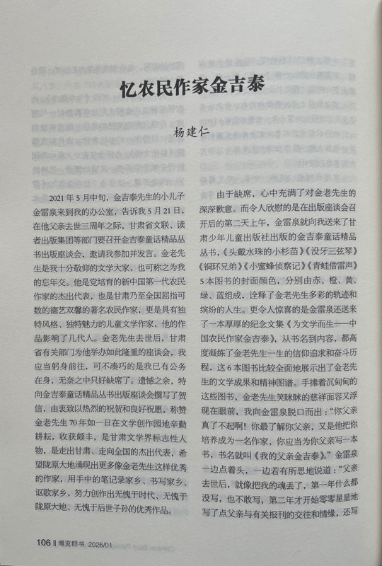 由于缺席,心中充滿了對(duì)金老先生的深深歉意。而令人欣慰的是在出版座談會(huì)召開后的第二天上午,金雷泉就向我送來了甘肅少年兒童出版社出版的金吉泰童話精品叢書,《頭戴水珠的小杉苗》《沒牙三弦琴》《銅環(huán)兄弟》《小蜜蜂偵察記》《青蛙借雷聲》5本圖書的封面顏色,分別由赤、橙、黃、綠、藍(lán)組成,詮釋了金老先生多彩的軌跡和繽紛的人生。更令人驚喜的是金雷泉還送來了一本厚厚的紀(jì)念文集《為文學(xué)而生——中國(guó)農(nóng)民作家金吉泰》,從書名到內(nèi)容,都高度凝練了金老先生一生的信仰追求和奮斗歷程,這6本圖書比較全面地展示出了金老先生的文學(xué)成果和精神圖譜。手捧著沉甸甸的這些圖書,金老先生笑瞇瞇的慈祥面容又浮現(xiàn)在眼前,我向金雷泉脫口而出:“你父親真了不起??!你最了解你父親,又是他把你培養(yǎng)成為一名作家,你應(yīng)當(dāng)為你父親寫一本書,書名就叫《我的父親金吉泰》。”金雷泉一邊點(diǎn)著頭,一邊若有所思地說道:“父親去世后,就像把我的魂丟了,第一年什么都沒寫,也不敢寫,第二年才開始零零星星地寫了點(diǎn)父親與有關(guān)報(bào)刊的交往和情緣,還寫了點(diǎn)父親在生活和寫作中的軼事趣聞。您的建議非常好,我擔(dān)心駕馭不好,試試看吧。”我感覺金雷泉有點(diǎn)為難,馬上又安慰他:“不急,你用兩三年時(shí)間慢慢寫。”