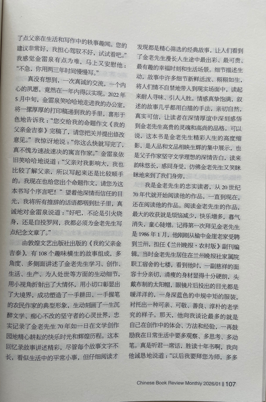 由敦煌文藝出版社出版的《我的父親金吉泰》,有108個(gè)趣味橫生的故事組成,多角度、多側(cè)面講述了金老先生學(xué)習(xí)、創(chuàng)作、生活、生產(chǎn)、為人處世等方面的生動(dòng)細(xì)節(jié),用小視角折射出了大情懷,用小切口彰顯出了大境界,成功塑造了一手耕田、一手握筆的農(nóng)民作家的典型形象,生動(dòng)刻畫了一生沉醉文學(xué)、癡心不改的堅(jiān)守者的心靈世界,忠實(shí)記錄了金老先生70年如一日在文學(xué)創(chuàng)作園地精心耕耘的快樂時(shí)光和輝煌歷程。這本回憶錄故事講述精彩,盡管每個(gè)故事文字不長(zhǎng),看似生活中的平常小事,但仔細(xì)閱讀才發(fā)現(xiàn)都是精心篩選的經(jīng)典故事,讓人們看到了金老先生漫長(zhǎng)人生途中最出彩、最可貴、最有趣的幸福時(shí)刻和生活場(chǎng)景。細(xì)節(jié)描述生動(dòng),故事中許多細(xì)節(jié)新鮮活潑、栩栩如生,將人們情不自禁地帶入到現(xiàn)實(shí)場(chǎng)面中,讀起來耐人尋味、引人入勝。情感真摯飽滿,敘述的故事幾乎都用白描的手法,親切自然,真實(shí)可信,讓讀者在深情厚誼中深刻感悟到金老先生高貴的靈魂和高尚的品格??梢哉f,這本書是金老先生精彩人生的高度縮影,是人品和文品相映生輝的集中展示,也是父子作家堅(jiān)守文學(xué)理想的深情告白,讀來韻味悠長(zhǎng),感同身受,仿佛金老先生又笑瞇瞇地來到了我們身旁。
