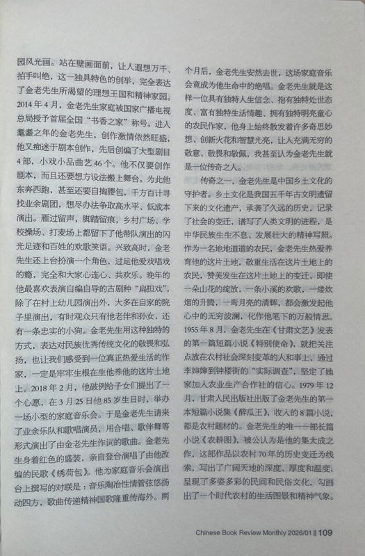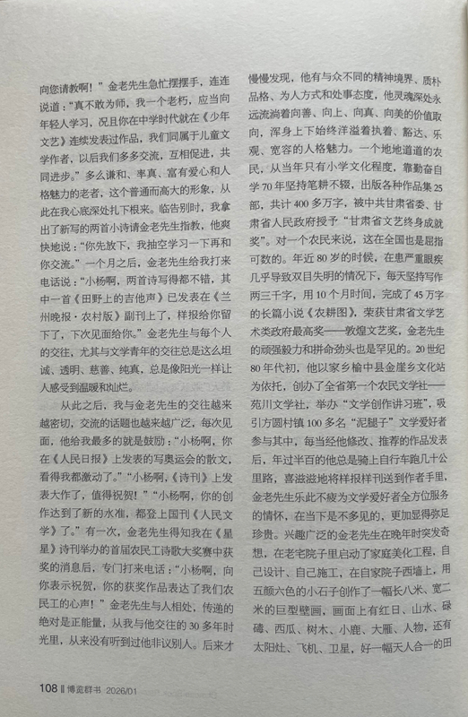 從此之后,我與金老先生的交往越來越密切,交流的話題也越來越廣泛,每次見面,他給我最多的就是鼓勵(lì):“小楊啊,你在《人民日?qǐng)?bào)》上發(fā)表的寫奧運(yùn)會(huì)的散文,看得我都激動(dòng)了。”“小楊啊,《詩刊》上發(fā)表大作了,值得祝賀!”“小楊啊,你的創(chuàng)作達(dá)到了新的水準(zhǔn),都登上國(guó)刊《人民文學(xué)》了。”有一次,金老先生得知我在《星星》詩刊舉辦的首屆農(nóng)民工詩歌大獎(jiǎng)賽中獲獎(jiǎng)的消息后,專門打來電話:“小楊啊,向你表示祝賀,你的獲獎(jiǎng)作品表達(dá)了我們農(nóng)民工的心聲!”金老先生與人相處,傳遞的絕對(duì)是正能量,從我與他交往的30多年時(shí)光里,從來沒有聽到過他非議別人。后來才慢慢發(fā)現(xiàn),他有與眾不同的精神境界、質(zhì)樸品格、為人方式和處事態(tài)度,他靈魂深處永遠(yuǎn)流淌著向善、向上、向真、向美的價(jià)值取向,渾身上下始終洋溢著執(zhí)著、豁達(dá)、樂觀、寬容的人格魅力。一個(gè)地地道道的農(nóng)民,從當(dāng)年只有小學(xué)文化程度,靠勤奮自學(xué)70年堅(jiān)持筆耕不輟,出版各種作品集25部,共計(jì)400多萬字,被中共甘肅省委、甘肅省人民政府授予“甘肅省文藝終身成就獎(jiǎng)”。對(duì)一個(gè)農(nóng)民來說,這在全國(guó)也是屈指可數(shù)的。年近80歲的時(shí)候,在患嚴(yán)重眼疾幾乎導(dǎo)致雙目失明的情況下,每天堅(jiān)持寫作兩三千字,用10個(gè)月時(shí)間,完成了45萬字的長(zhǎng)篇小說《農(nóng)耕圖》,榮獲甘肅省文學(xué)藝術(shù)類政府最高獎(jiǎng)——敦煌文藝獎(jiǎng),金老先生的頑強(qiáng)毅力和拼命勁頭也是罕見的。20世紀(jì)80年代初,他以家鄉(xiāng)榆中縣金崖鄉(xiāng)文化站為依托,創(chuàng)辦了全省第一個(gè)農(nóng)民文學(xué)社——苑川文學(xué)社,舉辦“文學(xué)創(chuàng)作講習(xí)班”,吸引方圓村鎮(zhèn)100多名“泥腿子”文學(xué)愛好者參與其中,每當(dāng)經(jīng)他修改、推薦的作品發(fā)表后,年過半百的他總是騎上自行車跑幾十公里路,喜滋滋地將樣報(bào)樣刊送到作者手里,金老先生樂此不疲為文學(xué)愛好者全方位服務(wù)的情懷,在當(dāng)下是不多見的,更加顯得彌足珍貴。興趣廣泛的金老先生在晚年時(shí)突發(fā)奇想,在老宅院子里啟動(dòng)了家庭美化工程,自己設(shè)計(jì)、自己施工,在自家院子西墻上,用五顏六色的小石子創(chuàng)作了一幅長(zhǎng)八米、寬二米的巨型壁畫,畫面上有紅日、山水、碌碡、西瓜、樹木、小鹿、大雁、人物,還有太陽灶、飛機(jī)、衛(wèi)星,好一幅天人合一的田園風(fēng)光畫。站在壁畫面前,讓人遐想萬千、拍手叫絕,這一獨(dú)具特色的創(chuàng)舉,完全表達(dá)了金老先生所渴望的理想王國(guó)和精神家園。2014年4月,金老先生家庭被國(guó)家廣播電視總局授予首屆全國(guó)“書香之家”稱號(hào)。進(jìn)入耄耋之年的金老先生,創(chuàng)作激情依然旺盛,他又癡迷于劇本創(chuàng)作,先后創(chuàng)編了大型劇目4部,小戲小品曲藝46個(gè)。他不僅要?jiǎng)?chuàng)作劇本,而且還要想方設(shè)法搬上舞臺(tái)。為此他東奔西跑,甚至還要自掏腰包,千方百計(jì)尋找業(yè)余劇團(tuán),想盡辦法爭(zhēng)取高水平、低成本演出。雁過留聲,腳踏留痕,鄉(xiāng)村廣場(chǎng)、學(xué)校操場(chǎng)、打麥場(chǎng)上都留下了他帶隊(duì)演出的閃光足跡和百姓的歡歌笑語。興致高時(shí),金老先生還上臺(tái)扮演一個(gè)角色,過足他愛戲唱戲的癮,完全和大家心連心、共歡樂。晚年的他最喜歡表演自編自導(dǎo)的古劇種“扁擔(dān)戲”,除了在村上幼兒園演出外,大多在自家的院子里演出,有時(shí)觀眾只有他老伴和孫女,還有一條忠實(shí)的小狗。金老先生用這種獨(dú)特的方式,表達(dá)對(duì)民族優(yōu)秀傳統(tǒng)文化的敬畏和弘揚(yáng),也讓我們感受到一位真正熱愛生活的作家,一定是牢牢生根在生他養(yǎng)他的這片土地上。2018年2月,他破例給子女們提出了一個(gè)心愿,在3月25日他85歲生日時(shí),舉辦一場(chǎng)小型的家庭音樂會(huì)。于是金老先生請(qǐng)來了業(yè)余樂隊(duì)和歌唱演員,用合唱、歌伴舞等形式演出了由金老先生作詞的歌曲。金老先生身著紅色的盛裝,親自登臺(tái)演唱了由他改編的民歌《繡荷包》。他為家庭音樂會(huì)演出臺(tái)上撰寫的對(duì)聯(lián)是:音樂陶冶性情管弦悠揚(yáng)動(dòng)四方,歌曲傳遞精神國(guó)歌隆重傳海外。兩個(gè)月后,金老先生安然去世,這場(chǎng)家庭音樂會(huì)竟成為他生命中的絕唱。金老先生就是這樣一位具有獨(dú)特人生信念、抱有獨(dú)特處世態(tài)度、富有獨(dú)特生活情趣、擁有獨(dú)特明亮童心的農(nóng)民作家,他身上始終散發(fā)著許多奇思妙想、創(chuàng)新火花和智慧光亮,讓人充滿無窮的敬意、敬畏和敬佩,我甚至認(rèn)為金老先生就是一位傳奇之人。