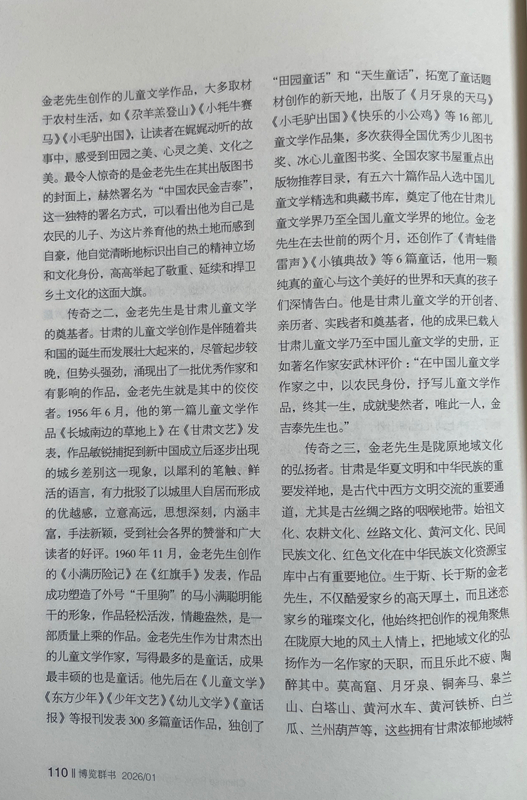 傳奇之二,金老先生是甘肅兒童文學(xué)的奠基者。甘肅的兒童文學(xué)創(chuàng)作是伴隨著共和國(guó)的誕生而發(fā)展壯大起來的,盡管起步較晚,但勢(shì)頭強(qiáng)勁,涌現(xiàn)出了一批優(yōu)秀作家和有影響的作品,金老先生就是其中的佼佼者。1956年6月,他的第一篇兒童文學(xué)作品《長(zhǎng)城南邊的草地上》在《甘肅文藝》發(fā)表,作品敏銳捕捉到新中國(guó)成立后逐步出現(xiàn)的城鄉(xiāng)差別這一現(xiàn)象,以犀利的筆觸、鮮活的語言,有力批駁了以城里人自居而形成的優(yōu)越感,立意高遠(yuǎn),思想深刻,內(nèi)涵豐富,手法新穎,受到社會(huì)各界的贊譽(yù)和廣大讀者的好評(píng)。1960年11月,金老先生創(chuàng)作的《小滿歷險(xiǎn)記》在《紅旗手》發(fā)表,作品成功塑造了外號(hào)“千里駒”的馬小滿聰明能干的形象,作品輕松活潑,情趣盎然,是一部質(zhì)量上乘的作品。金老先生作為甘肅杰出的兒童文學(xué)作家,寫得最多的是童話,成果最豐碩的也是童話。他先后在《兒童文學(xué)》《東方少年》《少年文藝》《幼兒文學(xué)》《童話報(bào)》等報(bào)刊發(fā)表300多篇童話作品,獨(dú)創(chuàng)了“田園童話”和“天生童話”,拓寬了童話題材創(chuàng)作的新天地,出版了《月牙泉的天馬》《小毛驢出國(guó)》《快樂的小公雞》等16部?jī)和膶W(xué)作品集,多次獲得全國(guó)優(yōu)秀少兒圖書獎(jiǎng)、冰心兒童圖書獎(jiǎng)、全國(guó)農(nóng)家書屋重點(diǎn)出版物推薦目錄,有五六十篇作品入選中國(guó)兒童文學(xué)精選和典藏書庫,奠定了他在甘肅兒童文學(xué)界乃至全國(guó)兒童文學(xué)界的地位。金老先生在去世前的兩個(gè)月,還創(chuàng)作了《青蛙借雷聲》《小鎮(zhèn)典故》等6篇童話,他用一顆純真的童心與這個(gè)美好的世界和天真的孩子們深情告白。他是甘肅兒童文學(xué)的開創(chuàng)者、親歷者、實(shí)踐者和奠基者,他的成果已載入甘肅兒童文學(xué)乃至中國(guó)兒童文學(xué)的史冊(cè),正如著名作家安武林評(píng)價(jià):“在中國(guó)兒童文學(xué)作家之中,以農(nóng)民身份,抒寫兒童文學(xué)作品,終其一生,成就斐然者,唯此一人,金吉泰先生也。”
