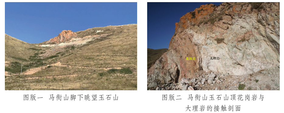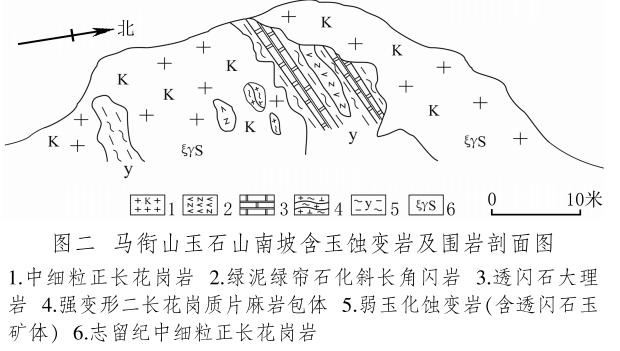 馬銜山玉礦分布在馬銜山東南部的玉石山(圖版一),海拔3028米。山上出露的地質(zhì)體主要為古元古界馬銜山巖群、中元古代片麻二長花崗質(zhì)巖[3]和志留紀(jì)正長花崗巖及正長巖。馬銜山巖群的巖性為黑云斜長片麻巖、變粒巖、斜長角閃巖和白云質(zhì)大理巖,巖石普遍遭受了韌性變形,變余糜稜巖發(fā)育。志留紀(jì)巖漿侵入期后熱液活動(dòng)較強(qiáng),石英脈細(xì)脈發(fā)育,局部見螢石礦化或礦床[4]。玉礦化主要產(chǎn)于馬銜山巖群與志留紀(jì)正長花崗巖和正長巖接觸帶上(圖版二),具體賦存在與白云質(zhì)大理巖的接觸部位,是正長花崗巖及正長巖與鎂質(zhì)大理巖接觸交代蝕變的產(chǎn)物[5]。花崗巖與片麻巖、變粒巖和斜長角閃巖接觸界線附近巖石雖有蝕變,但不見玉化蝕變巖或玉石出露。在近山頂開采玉石揭露的一個(gè)地質(zhì)剖面清晰地顯示了這些特征(圖二)。該剖面大致呈東西走向,長約50米,馬銜山巖群多呈殘留體出露,斜長角閃巖綠泥綠簾石化強(qiáng)烈,大理巖普遍發(fā)生蝕變,形成透輝透閃石大理巖,緊靠花崗巖接觸地帶發(fā)育窄窄的透閃石玉礦帶?,F(xiàn)在人們找玉,也主要在該剖面上的花崗巖和鎂質(zhì)大理巖的接觸帶上鑿洞,在接觸帶上見有多處采挖玉石的洞穴。在該剖面西側(cè)約50米,發(fā)育有正長巖與大理巖的混染帶,肉紅色正長巖中包裹混染著大量灰綠色透閃透輝大理巖,部分已蝕變?yōu)橥搁W透輝石巖,且質(zhì)地較細(xì)膩,成為半玉化巖石。剖面和周圍地質(zhì)特征表明,玉礦的形成是早古生代志留紀(jì)花崗質(zhì)雜巖體侵入到古元古代鎂質(zhì)大理巖,發(fā)生接觸交代蝕變作用的結(jié)果,在兩種巖石接觸帶形成玉礦體。但并不是蝕變帶中的巖石都是透閃石玉石,透閃石玉在蝕變帶中多呈雞窩狀或不規(guī)則狀分布,少量呈脈狀出露。從剖面及部分采坑的規(guī)模來看,玉礦體向深處有變大、變好的趨勢(shì),這主要受控于接觸面產(chǎn)狀,在傾角較緩處礦體相對(duì)較大。橫向上在背離接觸面方向圍巖具有從透閃石玉到透閃透輝石玉、透閃透輝石大理巖再到含透閃石大理巖的變化特征,反映了交代蝕變強(qiáng)度與接觸帶溫度及熱液成分變化的密切關(guān)系。從玉礦體到蝕變圍巖由于成分和結(jié)構(gòu)的變化出現(xiàn)一系列不同類型的玉石或巖石。我們?cè)谄拭嫔喜杉揭恍┬K的淡綠色玉料(圖版三)和出露較寬的微晶大理巖,經(jīng)偏光顯微鏡下薄片鑒定和XRF檢測(cè),確定有透閃石玉、透輝透閃玉、透閃透輝石玉、透閃透輝石大理巖和含透閃石大理巖等,這與馬家窯遺址出土的齊家文化時(shí)期大部分玉質(zhì)品玉料類型基本一致[6]。部分地段近礦圍巖還有透輝石巖、透輝矽卡巖、矽卡巖化大理巖、蛇紋石化大理巖、斜長透輝石巖等。玉石山的采洞(坑)由于資源與環(huán)境保護(hù)的要求,大多已被填埋,但仍可見采坑殘留的位置。采洞(坑)均位于大理巖與正長花崗巖接觸帶靠近大理巖一側(cè),這也間接顯示了玉礦體的位置。此外,玉石山花崗巖中石英細(xì)脈較發(fā)育,局部可見螢石礦化,反映了花崗巖侵入期后低溫?zé)嵋夯顒?dòng)仍較強(qiáng),對(duì)玉礦也有一定的改造影響。