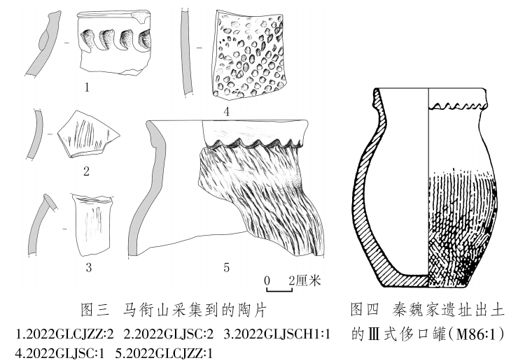 陶片 2片,2022GLCJZZ∶1,罐殘片,夾砂紅陶,腹部以下缺失。侈口,上有煙熏痕跡。短頸,頸上部有一圈鋸齒狀凸飾,鼓腹,頸部和腹部滿飾粗繩紋。復(fù)原口徑12、器壁厚0.6~1、殘高10厘米(圖三,5)。與秦魏家遺址出土的齊家文化Ⅲ式侈口罐(圖四)[16]形制相似。2022GLCJZZ∶2,罐口沿殘片,夾砂紅陶。口沿下有月牙狀附加堆紋。口沿殘長5.3、殘高4.8、厚0.7厘米(圖三,1)。