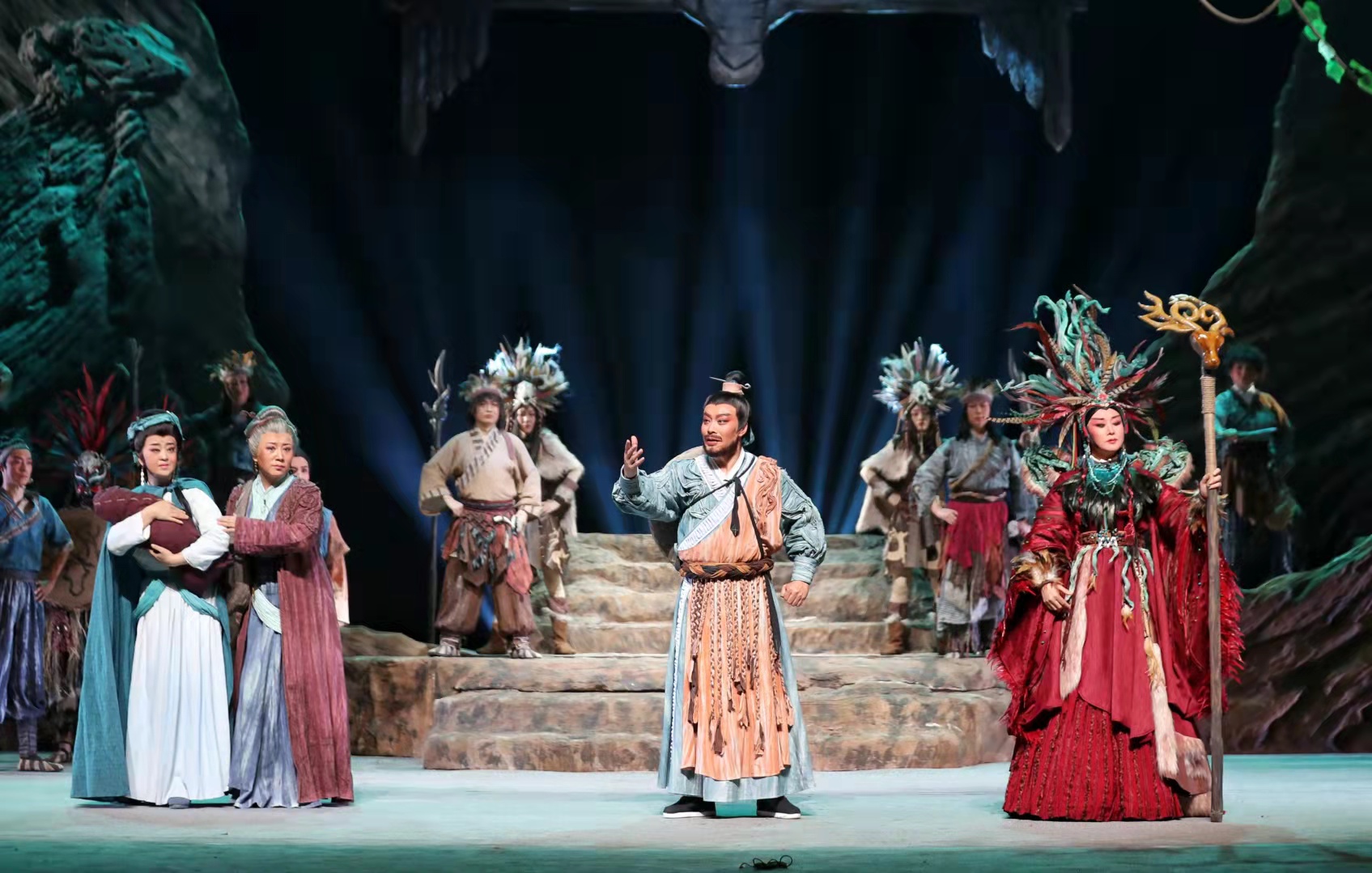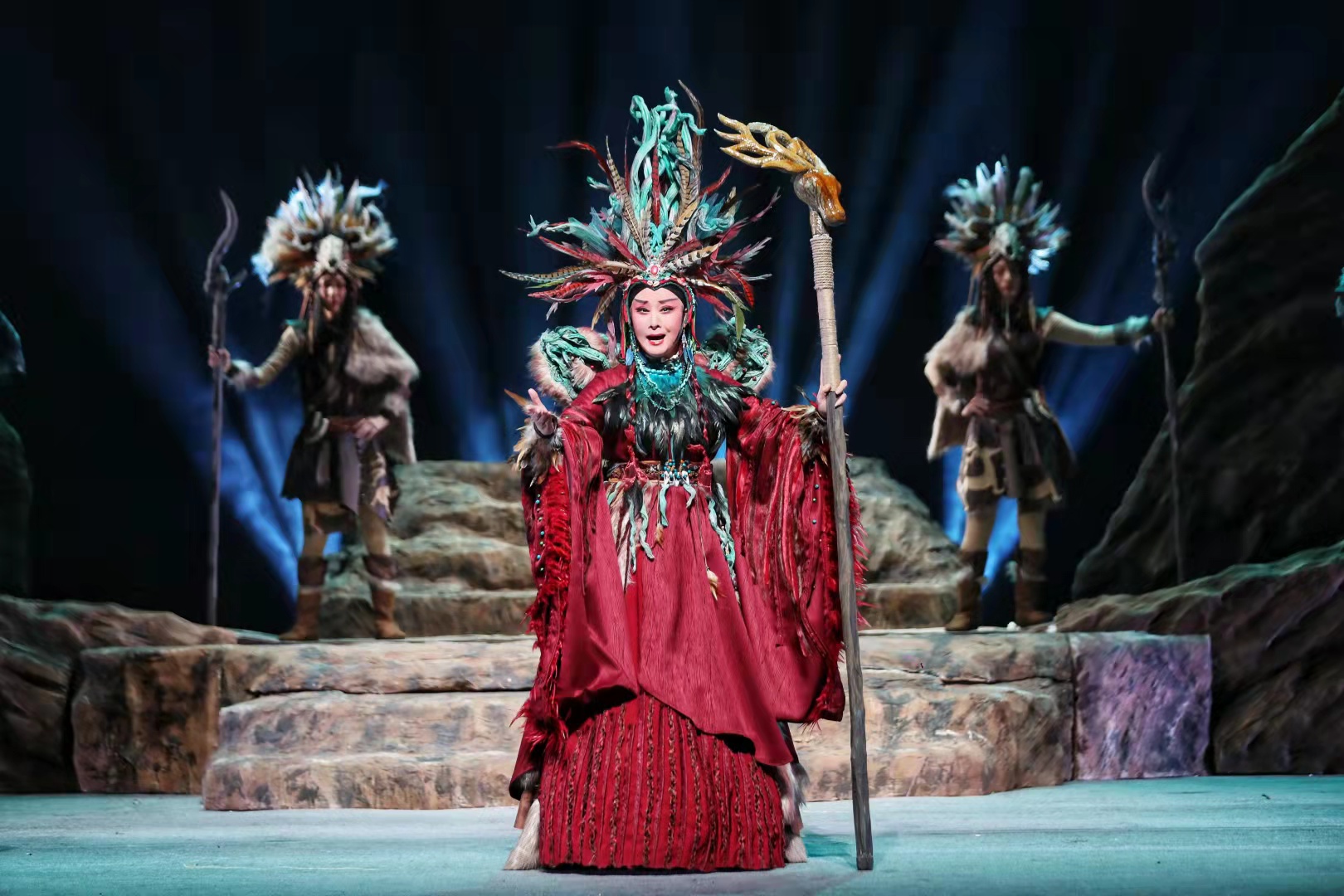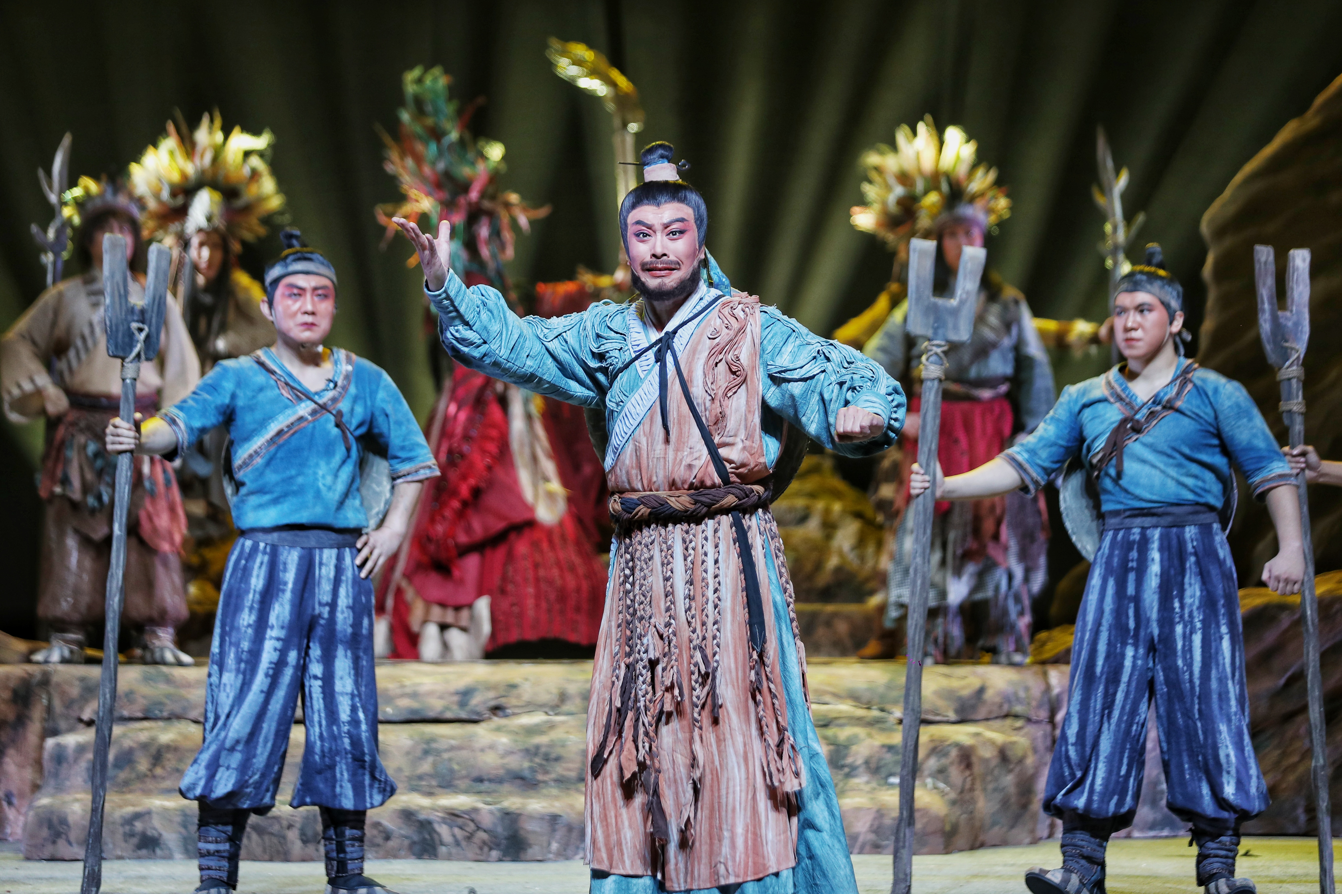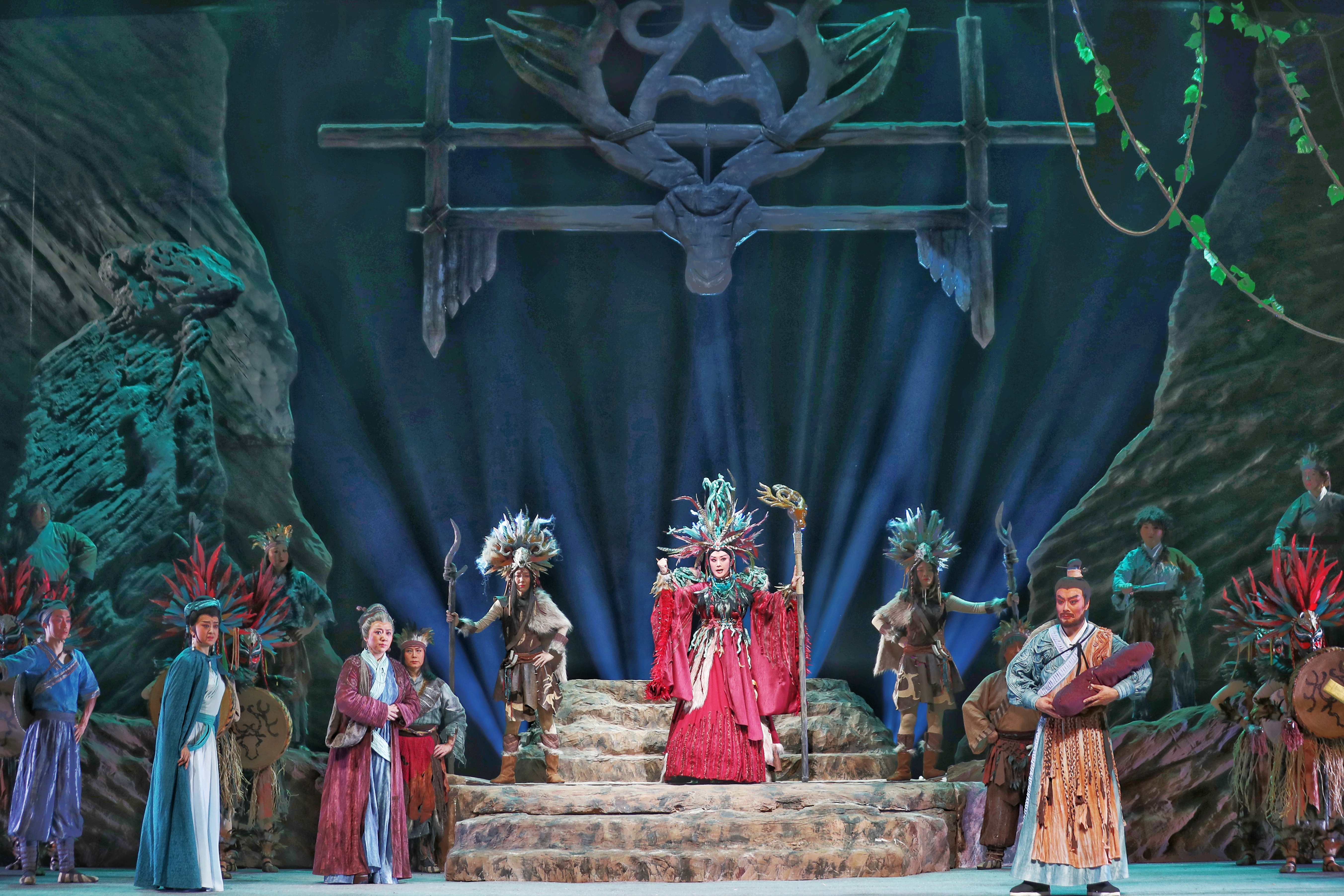 在兩個(gè)多小時(shí)的演出中,扮演“大禹”的邵炳德唱念做打俱佳,將一個(gè)人性化、頂天立地的大禹形象立于舞臺(tái)之上,三朵隴劇“梅花”雷通霞、佟紅梅、竇鳳霞,分別在劇中扮演山戎、大禹妻子涂嬌和禹母的角色,全體演員以精湛的表演,將大禹治水過程中天理與人性、親情與仇恨、生與死的抉擇演繹得淋漓盡致。