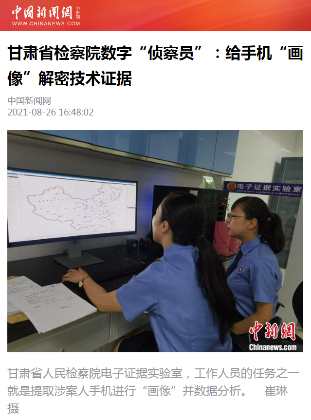 2021年8月26日,中國新聞網(wǎng)發(fā)布新聞《甘肅省檢察院數(shù)字“偵察員”:給手機“畫像”解密技術(shù)證據(jù)》。