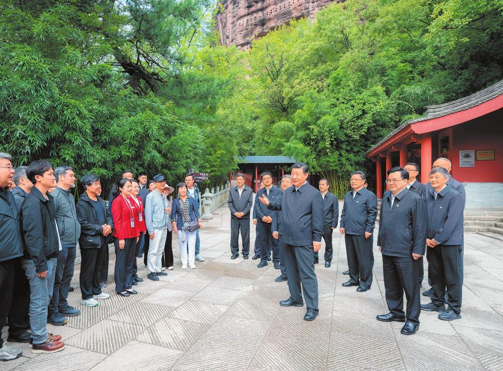 隨后,習(xí)近平來到麥積山石窟,沿著棧道仔細(xì)察看距今1600多年的洞窟和雕塑、壁畫,同保護(hù)修復(fù)工作人員親切交流。習(xí)近平說,我國四大石窟是中華文明的瑰寶,都具有重要的歷史價值、文化價值。他希望文物工作者賡續(xù)“莫高精神”,潛心為國護(hù)寶,為傳承創(chuàng)新中華優(yōu)秀傳統(tǒng)文化、增強(qiáng)中華文化影響力作出更大貢獻(xiàn)。