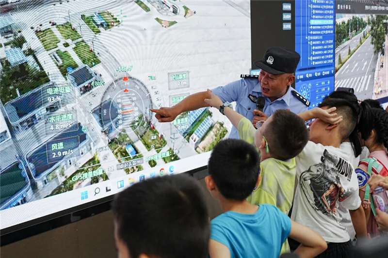 帶著興奮和期待,小朋友們的警營探索之旅開始了!在奧體中心警務(wù)站和警航作戰(zhàn)單元,他們沉浸式參觀了現(xiàn)代警務(wù)工作和警用無人機(jī)的指揮調(diào)度,直觀了解了公安工作的日常場景。另一邊,小朋友們在民警的指導(dǎo)下,一個(gè)個(gè)親手拿著警用武器裝備零距離“拍照打卡”,“這個(gè)好酷!”“看我的!”小朋友們的驚嘆聲此起彼伏。