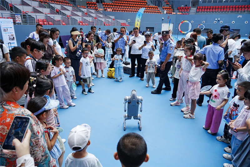 緊接著,在網(wǎng)球館前,大家首先被特警隊(duì)員精彩的防暴小隊(duì)?wèi)?zhàn)術(shù)演練所震撼,矯健的身手贏得了陣陣掌聲。警犬迅猛精準(zhǔn)的撲咬展示更是讓小朋友們連連叫好。警用機(jī)器狗的靈活表演引得大家紛紛上前互動(dòng),最讓小朋友們躍躍欲試的還是無人機(jī)穿梭器的體驗(yàn)環(huán)節(jié),戴上眼鏡感受著穿梭器的“速度與激情”,孩子們臉上洋溢著喜悅和興奮,近距離感受到了科技在公安工作中的強(qiáng)大應(yīng)用。