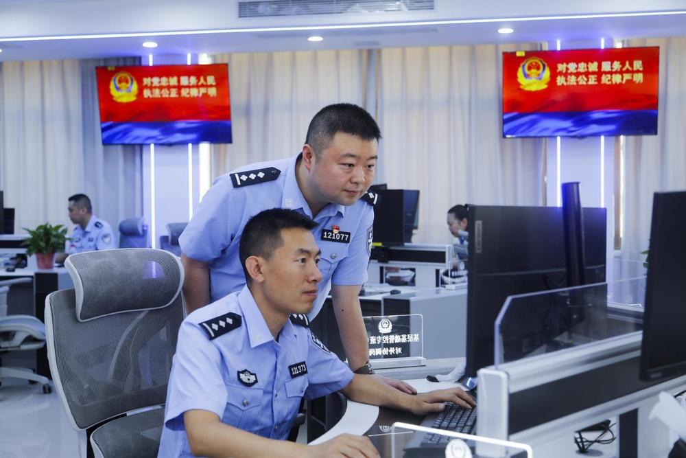 王雪龍(后)與同事研判業(yè)務(wù)。