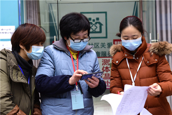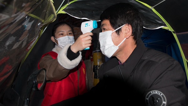 自疫情防控工作開展以來,湖北省咸寧市咸安區(qū)紀委監(jiān)委90后干部黃煬,始終堅守防疫一線,參與卡點值守、入戶摸排、生活物資代購等工作,耐心安撫居民情緒,為他們進行心理疏導。圖為黃煬為夜歸的居民測量體溫。(湖北省咸寧市咸安區(qū)紀委監(jiān)委 魯一凡 攝)