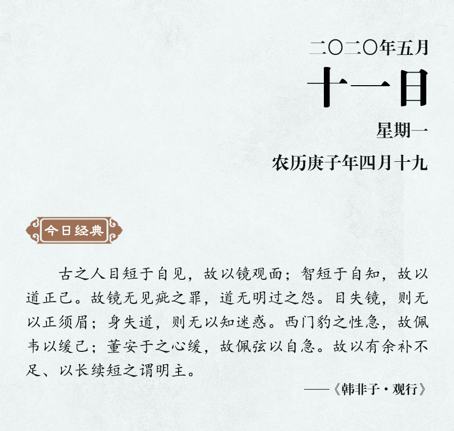 《老子》說(shuō):“知人者智,自知者明。”如果不能很好地認(rèn)識(shí)到自己的長(zhǎng)處和短處,就不能透徹地了解事物。韓非進(jìn)一步說(shuō):“目短于自見(jiàn),故以鏡觀面;智短于自知,故以道正己。”無(wú)論是明君還是賢人,都要明確認(rèn)識(shí)到自身的不足,如此才能自知自見(jiàn)。“目失鏡則無(wú)以正須眉,身失道則無(wú)以知迷惑。”這既是說(shuō)自見(jiàn)的局限,也是說(shuō)自知的重要。韓非舉例說(shuō),魏國(guó)的西門豹因?yàn)樾愿窦痹?,所以佩戴柔軟的皮帶?lái)提醒自己;董安于因?yàn)樾宰雍苈?,所以佩戴繃緊的弓弦來(lái)激勵(lì)自己,這兩位都是能夠自知不足的人。