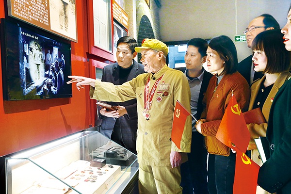 圖為江蘇省宜興市紀檢監(jiān)察干部參觀黨史陳列館,聆聽有65年黨齡的老黨員講述抗戰(zhàn)經(jīng)歷。鄒宜賓 攝