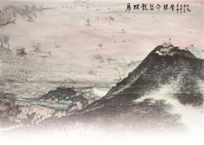 1949年4月23日,人民解放軍占領(lǐng)南京。毛澤東聞?dòng)嵑?,欣然寫下這首詩,描寫了人民解放軍橫渡長江、解放南京的雄偉壯闊、氣勢磅礴場面。在畫作中,畫家描繪的是南京城的壯麗景色,沐浴在朝暉之中的紫金山及其周圍景致,以浪漫的詩意呈現(xiàn)出來。近處,紫金山巍峨高聳,天文臺亦清晰可見;中景,江上輪渡往來,兩岸工廠林立,煙霧繚繞;遠(yuǎn)處,紅霞爛漫,水天一色。新中國成立后的南京繁忙而祥和,墨色淋漓間,新中國欣欣向榮的景象躍然紙上。