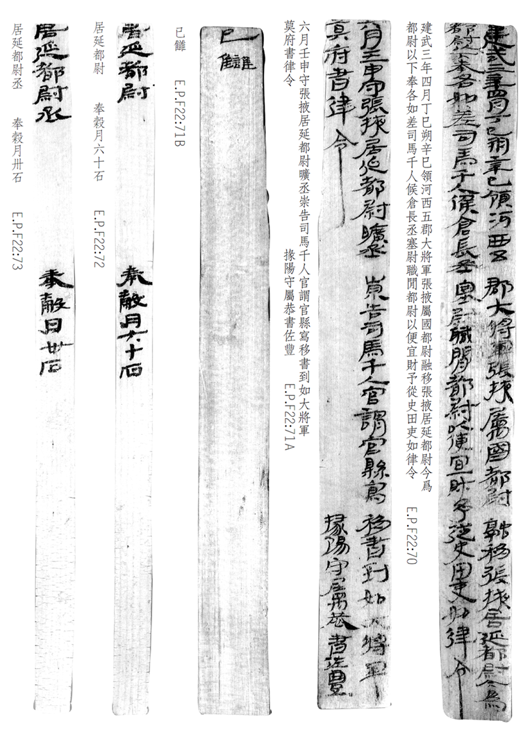 1974年8月出土于甲渠候官遺址第22號房址內(nèi)。簡冊由10枚簡組成,每簡長22.8厘米,前兩簡寬2.5厘米,其余8簡寬1.4厘米。全文200字。內(nèi)容為東漢建武三年(公元25年)竇融統(tǒng)治河西期間留下的一份完整的財政文書。簡文是關(guān)于居延都尉府吏員奉谷標準的通知,由領(lǐng)河西五郡大將軍張掖屬國都尉竇融幕府下發(fā),簡言“如律令”可知其指令具有法律效力。