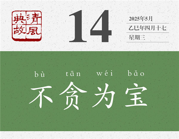 《幼學(xué)瓊林·珍寶》:“從吾所好,豈曰富而可求;有命存焉,當(dāng)以不貪為寶。”“寶”有物質(zhì)層面的,也有精神層面的。有些人為了追求物質(zhì)財(cái)富,而置道德操守甚至嚴(yán)刑峻法于不顧;不要說別人主動(dòng)之“獻(xiàn)”,甚至還會(huì)采取各種手段去“索”。有些人為了自己的尊嚴(yán)和操守,則會(huì)視來意不明、來路不清之財(cái)寶為“糞土”,他們寧愿一生清貧,也不會(huì)在金銀財(cái)寶面前心理失衡,不會(huì)在誘惑面前人格失守。