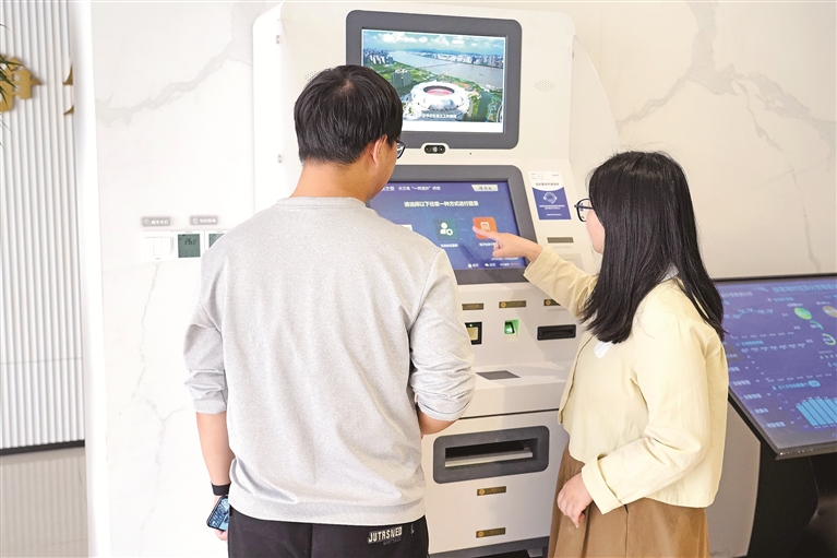 5月10日,浙江省平湖市林埭鎮(zhèn)徐家埭村的數(shù)智生活館內(nèi),村民在工作人員的幫助下,使用政務(wù)服務(wù)長(zhǎng)三角“一網(wǎng)通辦”終端辦理業(yè)務(wù)。金苗 攝