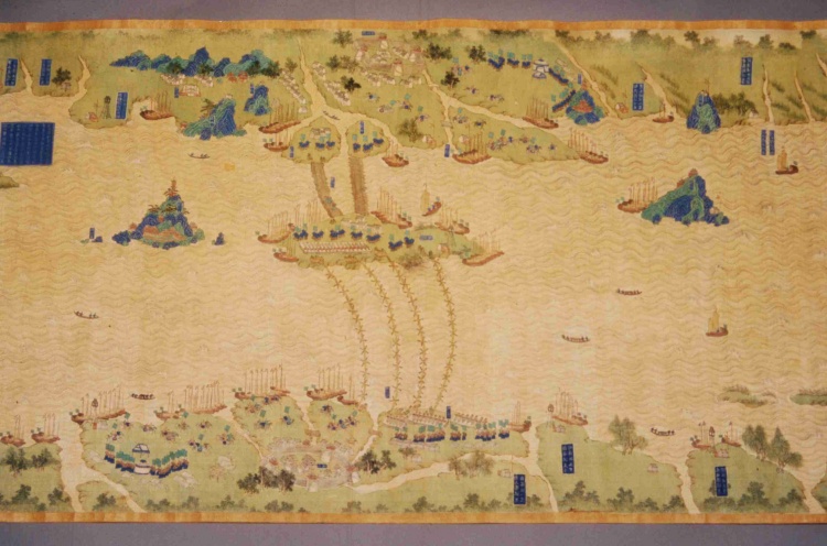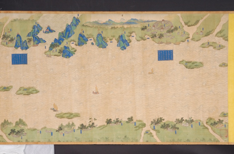 清代,縱59.7厘米,橫1340厘米。采用傳統(tǒng)技法繪制,上南下北,凡江水、港泊、洲渚、城池、村落、林木、山石、舟車、人物、旗幡、軍械均以立體形象呈現(xiàn),飾以石青、石綠等多種顏色。上起九江、下至鎮(zhèn)江,千里區(qū)域中列攔江纜、攔江牌、戰(zhàn)船、木樓、煙墩、駐軍地、營(yíng)等各種軍事設(shè)施,每營(yíng)均有金書(shū)大榜題,記述本營(yíng)所處位置及兵力布置狀況,每汛的標(biāo)題上還記有汛與汛之間的里數(shù)。