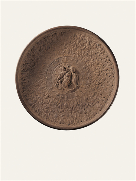 公元2-3世紀,靖遠縣征集,高4.6厘米,口徑31厘米,足徑10.9厘米。銀質鎏金,以鑄造、錘鍱等工藝制成,鎏金已大部脫落。圓形,卷唇,斜孤壁,圈足。盤內壁滿飾浮雕花紋,分3圈列置。外圈飾勾聯(lián)的葡萄卷草紋藤蔓,其間棲息30余只禽鳥等動物。中圈外緣飾細小聯(lián)珠紋,內周環(huán)列12個頭像,頭像間為禽鳥等動物,或為希臘神話中的奧林匹斯山12神。中心為一高浮雕裸體男性,卷發(fā)無須,身披長巾,右手持圖爾索斯杖,杖首為松果狀飾物,為希臘神話中的酒神狄俄尼索斯。酒神倚一花豹而坐,鼻梁凸出,側首張口,頸下帶花環(huán),身上遍布圓斑。盤底圈足內有一行刻作虛點的銘文,銘文年代晚于做器年代。此件器物發(fā)現(xiàn)于絲綢之路甘肅段的黃河渡口,是研究中西交流重要的實物資料,也是十分罕見的絲綢之路遺珍。