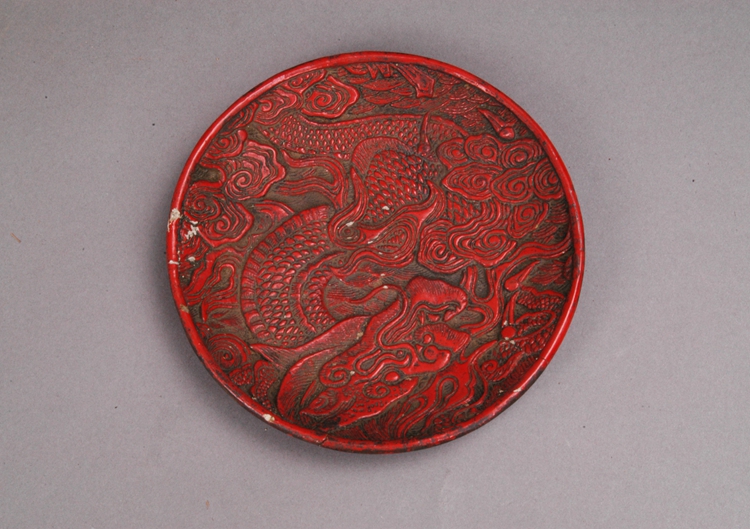清代,高1.8厘米,口徑13.5厘米。敞口,圓唇,弧壁,平底,內(nèi)髹紅漆,剔穿云龍紋,背髹黑漆,模印花卉。