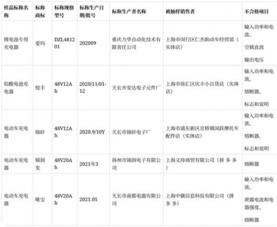 2021年長三角聯(lián)動(dòng)(上海)電動(dòng)自行車用充電器產(chǎn)品質(zhì)量監(jiān)督抽查不合格產(chǎn)品