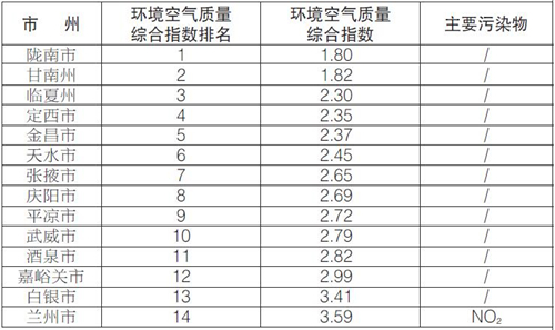 9月份,全省14個城市環(huán)境空氣質(zhì)量綜合排名由好到差分別為:隴南、甘南、臨夏、定西、金昌、天水、張掖、慶陽、平?jīng)?、武威、酒泉、嘉峪關(guān)、白銀、蘭州。