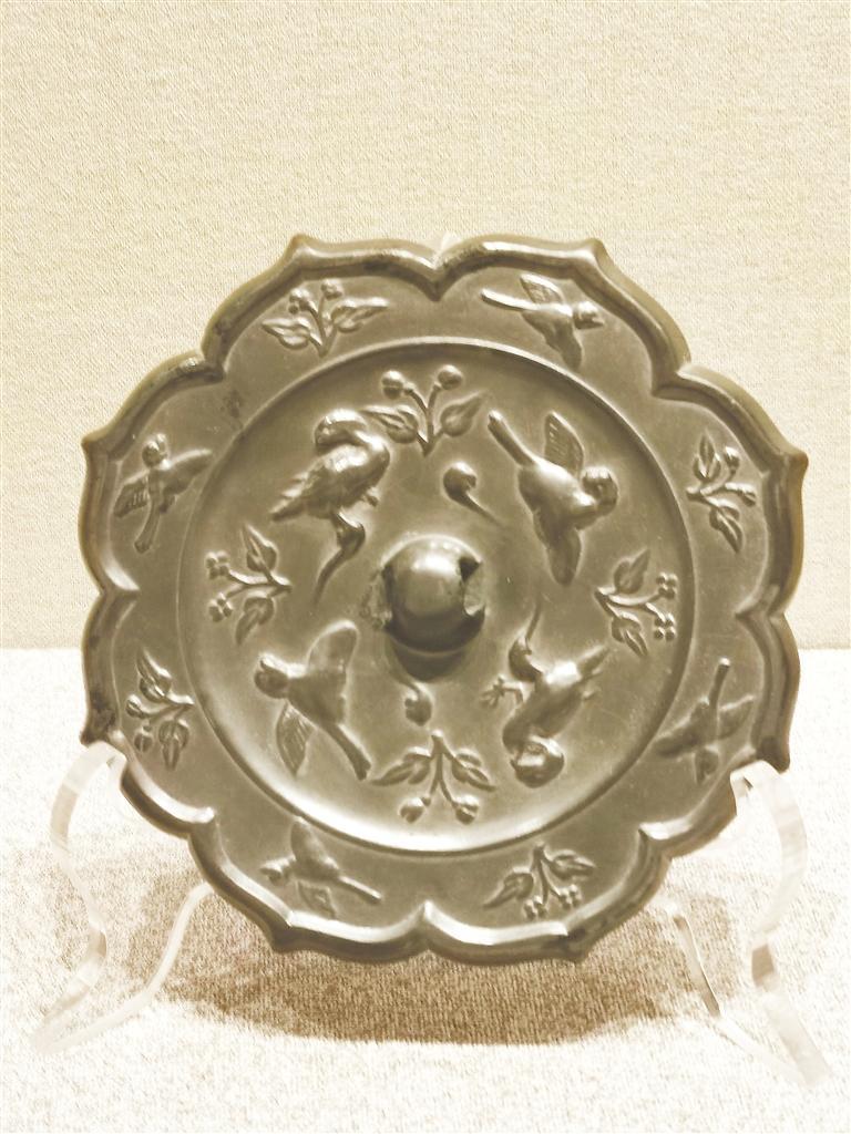平涼市博物館藏,唐代,八瓣菱花形,內切圓形,圓鈕。上下左右交隔對稱分布四只鸞鳥、四枝二葉二苞折枝花。