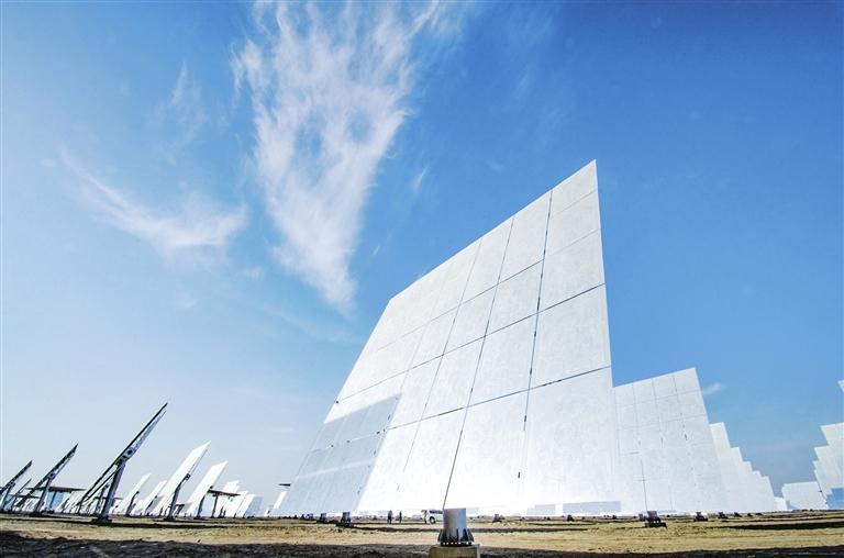 一排排風(fēng)電機組整齊列陣迎風(fēng)旋轉(zhuǎn),蔚然壯觀;成片的光伏板將茫茫戈壁裝點成浩瀚的藍色海洋,熠熠生輝;上萬塊定日鏡和吸熱塔構(gòu)成超級鏡子發(fā)電站,耀眼且震撼。