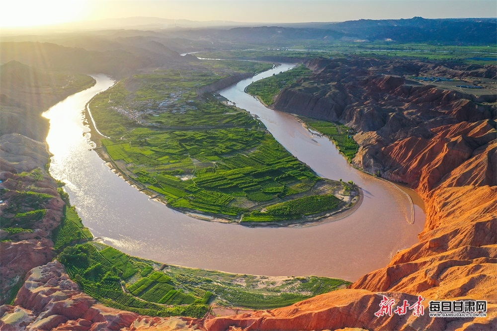 夏日,夕陽(yáng)西下,黃河在景泰五佛鄉(xiāng)境內(nèi)的車(chē)木峽繞了個(gè)大大的彎,位于黃河峽谷中的 車(chē)木峽山村高山環(huán)繞,周?chē)浅善臉?shù)林,廣袤的田野閃耀著瑰麗的色彩,靜靜地躺在綠色的懷抱之中。