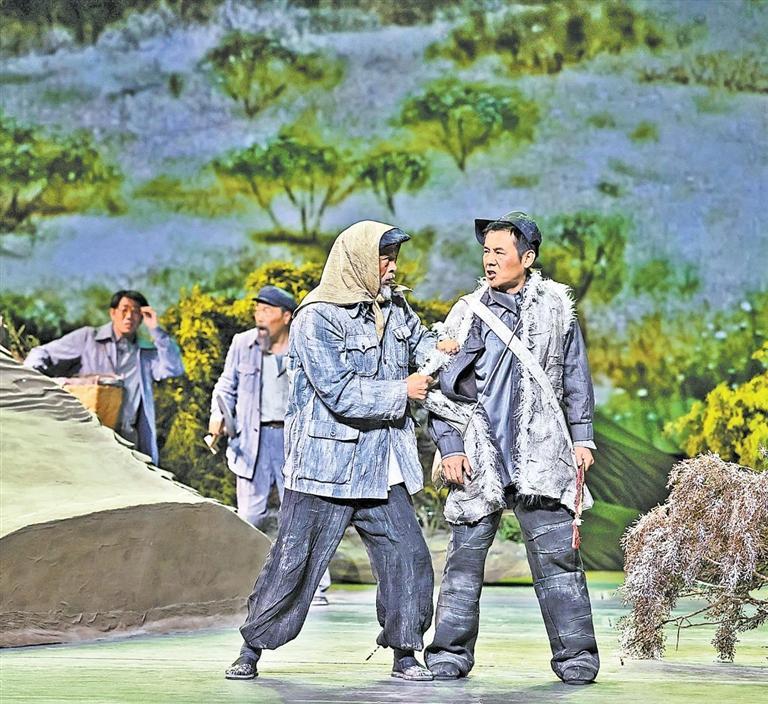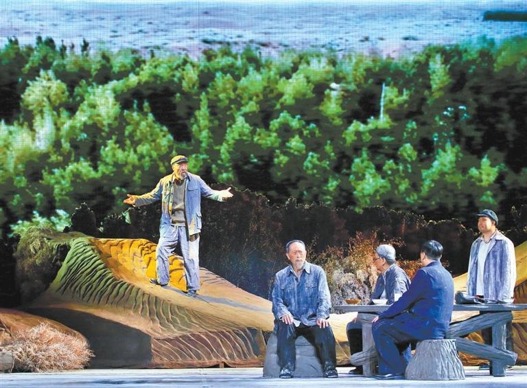 現(xiàn)實(shí)題材是話劇藝術(shù)的寵兒,在話劇進(jìn)入中國一百多年的時(shí)光中,現(xiàn)實(shí)題材創(chuàng)作占據(jù)相當(dāng)大的比例。在近當(dāng)代中國歷史的進(jìn)程中,話劇始終起著敢為天下先、針砭時(shí)弊的作用,但話劇又有其極其特殊的藝術(shù)框范。人們在觀看話劇時(shí),仿佛就是在觀看自己的人生,觀看自己和身邊最熟悉的人們,這是話劇藝術(shù)獨(dú)具的極高的審美要求。尤其是現(xiàn)代題材的創(chuàng)作,稍有不慎便會(huì)陷入同質(zhì)化的僵硬模式,使舞臺(tái)藝術(shù)失去應(yīng)有的美感。話劇《八步沙》讓6個(gè)老漢成為舞臺(tái)聚光燈下的主角,體現(xiàn)了創(chuàng)作者們呼應(yīng)時(shí)代之需,為最普通的農(nóng)民寫生立傳的拳拳之心。6個(gè)老農(nóng)民談不上人們通常意識(shí)中的“美”,“治沙”這樣的故事也相對比較單調(diào),不大容易出彩,而創(chuàng)作者們以八步沙這個(gè)真實(shí)的地名作為劇名,以“六老漢”治沙這個(gè)真實(shí)的事件作為全劇的敘述內(nèi)容,卻能宕開一筆把特定的外部環(huán)境與人物的內(nèi)心世界巧妙地融為一體,為全劇注入了濃郁飽滿的戲劇情境和情感,使這部話劇有了獨(dú)屬于自己的一份力度、一份無法替代的光彩。全劇的情節(jié)一曲三折,以小見大,當(dāng)黑壓壓的沙塵暴鋪天而來的時(shí)候,當(dāng)六老漢在嚴(yán)酷的環(huán)境中吃盡苦頭,摸索出“一棵樹,一把草,壓住沙子防風(fēng)掏”的寶貴經(jīng)驗(yàn),使漫無邊際的沙漠終于出現(xiàn)一抹綠色,繼而眼看著一棵又一棵綠樹成活成林,終于成為一片綠洲的時(shí)候,我相信觀眾的心也被藝術(shù)琴弦撥動(dòng),始終被劇情牽著走,為劇中人物的命運(yùn)擔(dān)心、懸心、痛心、開心,從中深深地感受到劇中所蘊(yùn)藏的豐富內(nèi)涵和它所傳達(dá)出的真切意趣。