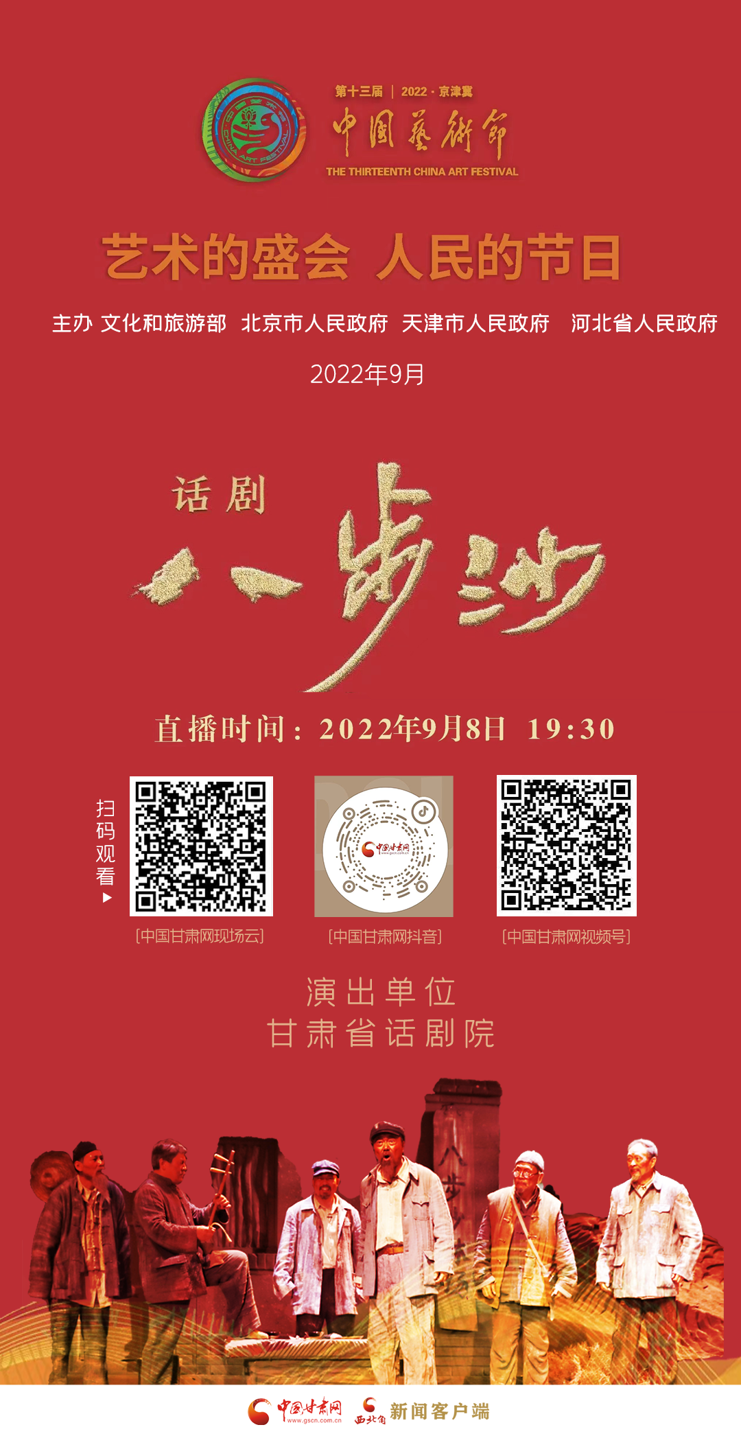 9月1日,由文化和旅游部、北京市政府、天津市政府、河北省政府共同主辦的第十三屆中國(guó)藝術(shù)節(jié)在北京開(kāi)幕。隨著藝術(shù)節(jié)大幕徐徐拉開(kāi),劇目展演和“文華獎(jiǎng)”評(píng)審工作同步展開(kāi),入圍第十七屆文華大獎(jiǎng)終評(píng)作品的話劇《八步沙》將代表甘肅省,與全國(guó)新創(chuàng)排的38部舞臺(tái)藝術(shù)作品一起角逐最終的文華大獎(jiǎng)。根據(jù)疫情防控要求,話劇《八步沙》將以線上評(píng)審的方式參演,期待廣大觀眾屆時(shí)觀看并點(diǎn)評(píng)。