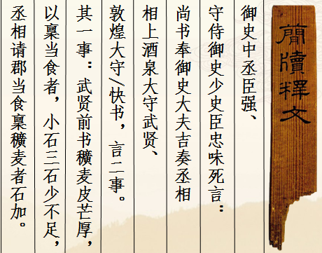 此簡(jiǎn)為漢宣帝回復(fù)酒泉太守“辛武賢”和敦煌太守“快”奏疏的恩準(zhǔn)詔書,簡(jiǎn)文記載的是皇帝詔書中對(duì)兩太守奏疏內(nèi)容的復(fù)述。從簡(jiǎn)文內(nèi)容看,酒泉太守辛武賢和敦煌太守快給朝廷的奏疏主要涉及兩件事情:一是辛武賢認(rèn)為作為糧草的穬麥因皮厚芒長(zhǎng),如按規(guī)定每人發(fā)放小石三石,會(huì)造成實(shí)際數(shù)量的不足,所以他請(qǐng)求皇帝每石加發(fā)若干。另一件事顯然是敦煌太守快的上書,但文字未能容納于此簡(jiǎn),故不得而知。