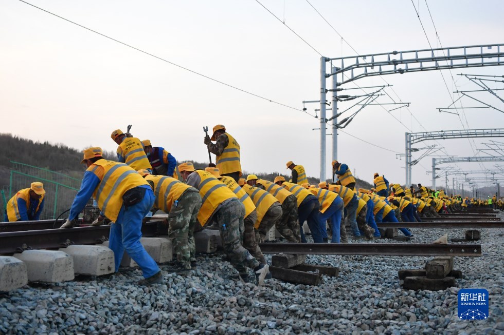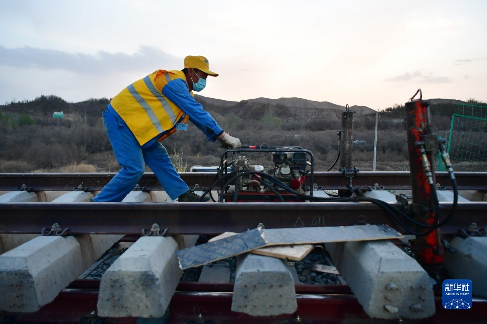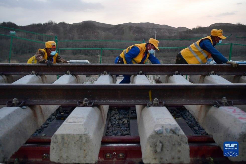中鐵十一局建設(shè)者在中蘭客專(甘肅段)接入中川城際鐵路道岔插鋪施工現(xiàn)場(chǎng)作業(yè)(4月26日攝)。新華社記者 陳斌 攝