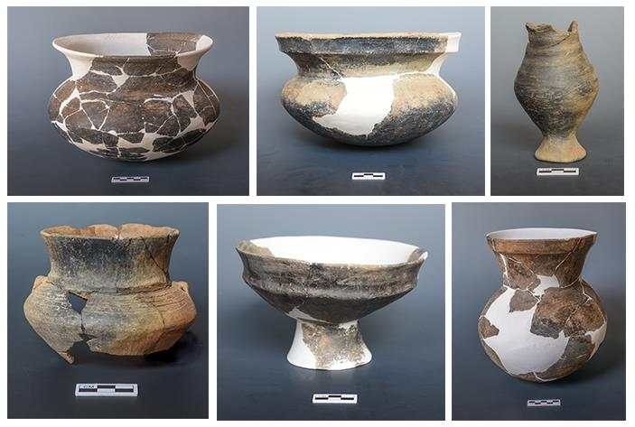 古城村遺址面積約4.2萬平方米,現(xiàn)存的貝丘堆積最厚處達6.5米,由大量尾部被敲破的螺螄殼與灰土層交替堆疊形成。碳十四測定年代為距今3600至2500年,約相當于中原地區(qū)的商代至兩周時期。商代遺存可分為早晚兩段,早段發(fā)現(xiàn)保存完整的橢圓形環(huán)壕聚落,由中心臺地、外圍環(huán)壕和護坡組成,中心臺地面積約27000平方米,環(huán)壕和護坡周長約600米,這種聚落格局一直延續(xù)至兩周時期。商代晚段發(fā)現(xiàn)一批土坑墓和甕棺葬。兩周時期的遺存以房址、螺殼堆、灰燼、活動面等居住類遺跡為主,房址多為方形半地穴式。出土青銅器、陶器、玉器、石器、骨器、木器等文物4000余件。