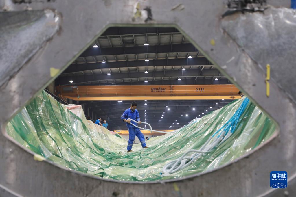 2月17日,在酒泉經(jīng)濟技術(shù)開發(fā)區(qū)的一家風(fēng)電葉片制造企業(yè),工人在風(fēng)機葉片生產(chǎn)線為葉片灌注做準備。